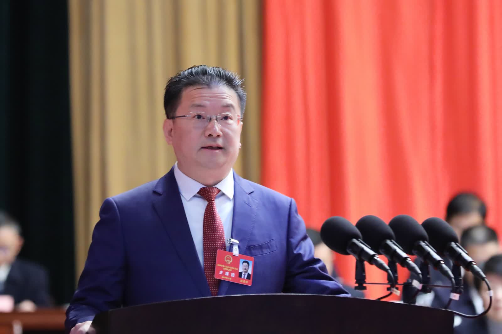 在熱烈的掌聲中,市長陳愛林代表市人民政府作工作報告。
