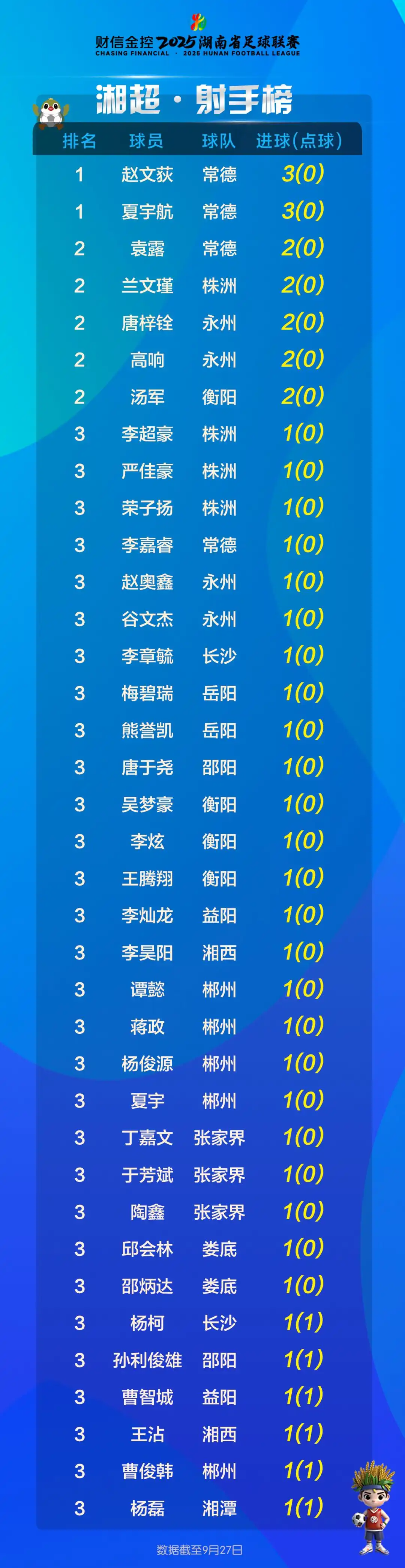 湘超積分榜(9月28日)