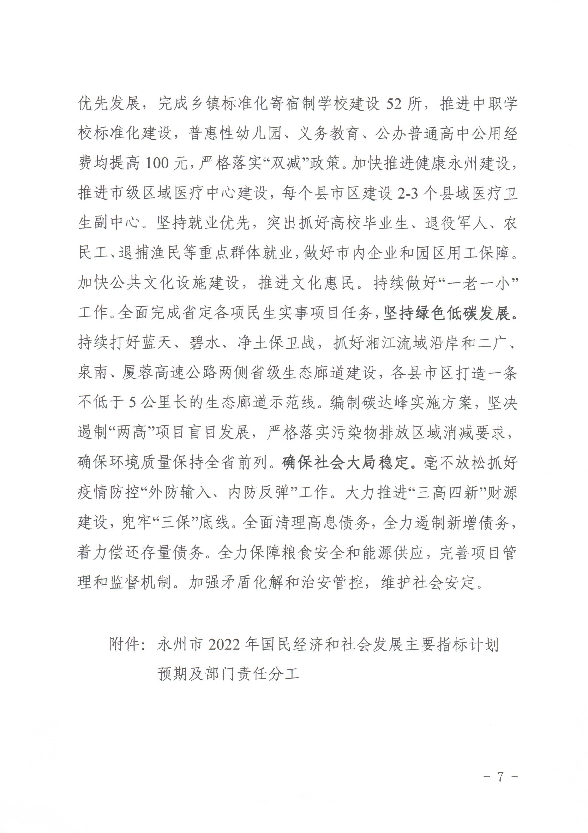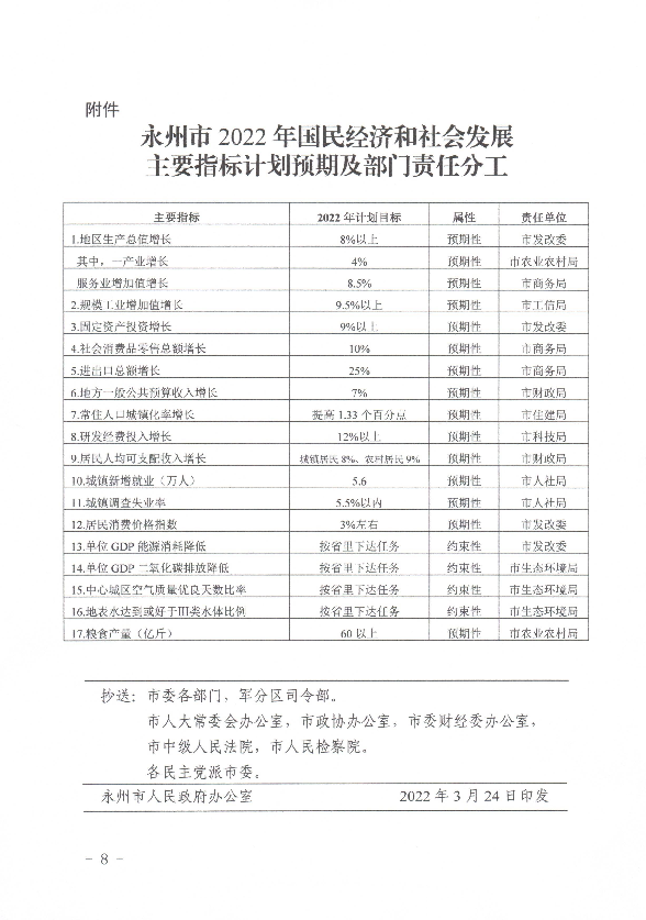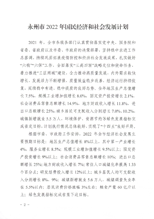 關于印發《永州市2022年國民經濟和社會發展計劃》的通知