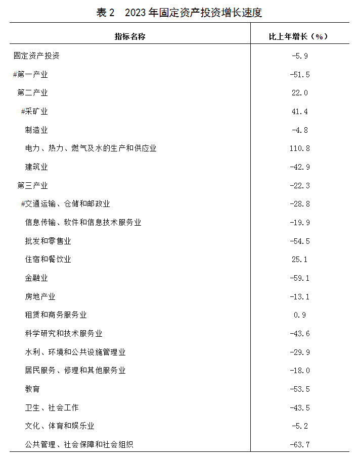 全年固定資產投資比上年下降5.9%。分經濟類型看,國有投資下降27.0%,民間投資下降0.3%。分投資方向看,工業投資增長22.3%,民生投資下降33.5%,生態投資下降4.3%,基礎設施投資下降29.2%,高新技術產業投資增長1.3%,工業技改投資下降19.2%。