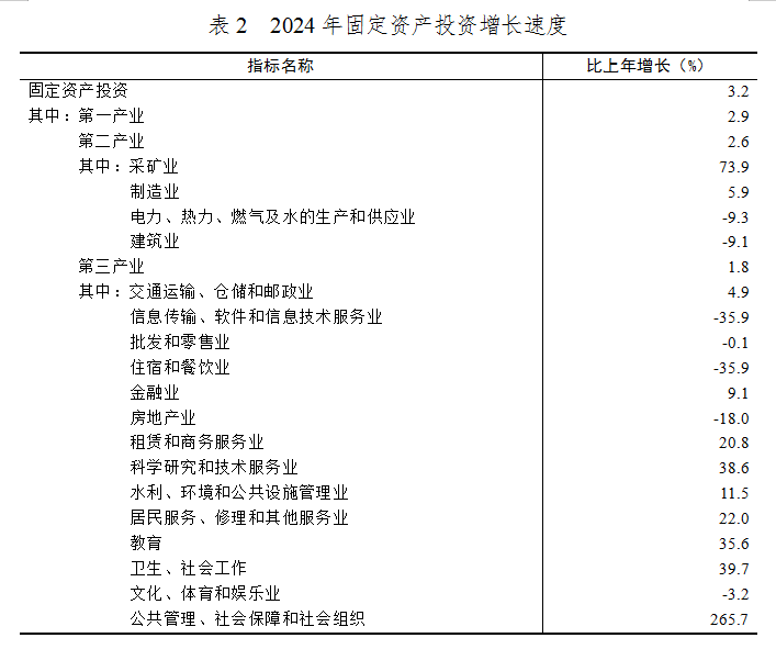 全年固定資產投資[5]比上年增長3.2 %。分經濟類型看,國有投資下降28.4 %;非國有投資增長10.9 %。分投資方向看,工業投資增長2.6 %,民生投資增長11.0 %,生態投資增長1.8 %,基礎設施投資增長8.3 %,高技術產業投資下降6.6 %,工業技改投資增長22.5 %。