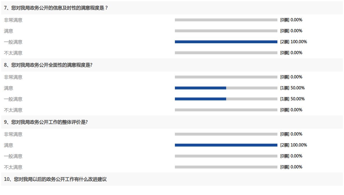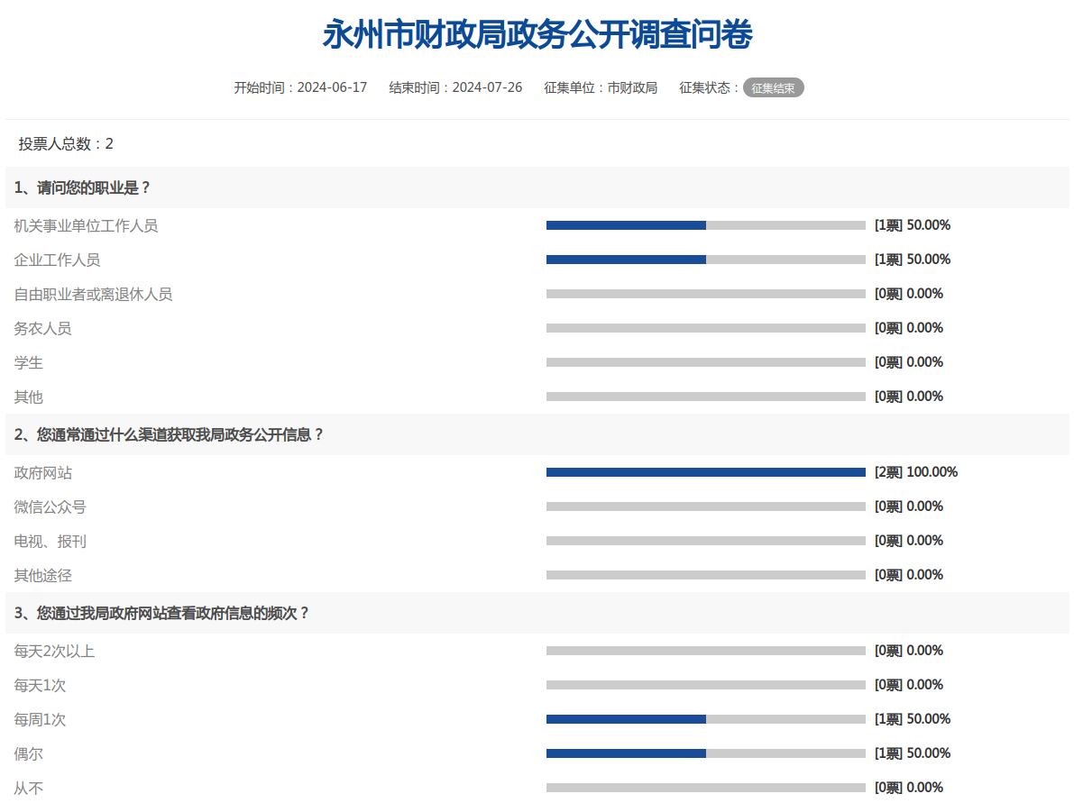 關于永州市財政局政務公開的調查問卷自2024年6月17日開始,至2024年7月26日結束,投票人數2人,具體情況見下圖統計: