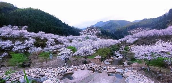 白白紅紅花面貌,絲絲裊裊柳腰身。藍山縣藍山谷景區內,多株櫻花盛放,浪漫絢爛如云似霞,朵朵櫻花競相開放,滿樹浪漫,美不勝收,彌漫著夢幻的浪漫氣息。