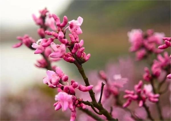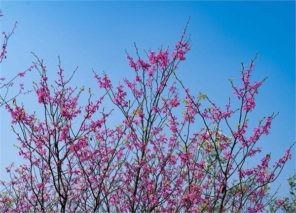 雜英紛已積,含芳獨暮春。紫荊每年聞春而綻,密密麻麻的小花爬滿了每根枝條,小小花朵的顏色如玫瑰一般美麗,盛開之時,猶如一群翩翩飛舞的蝴蝶盤旋在枝椏周圍,密密層層間呈現出一幅滿樹嫣紅的畫面。