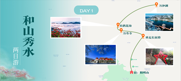 “和”字展館——重走長征路——萬和湖——萬壽寺——杜鵑花海