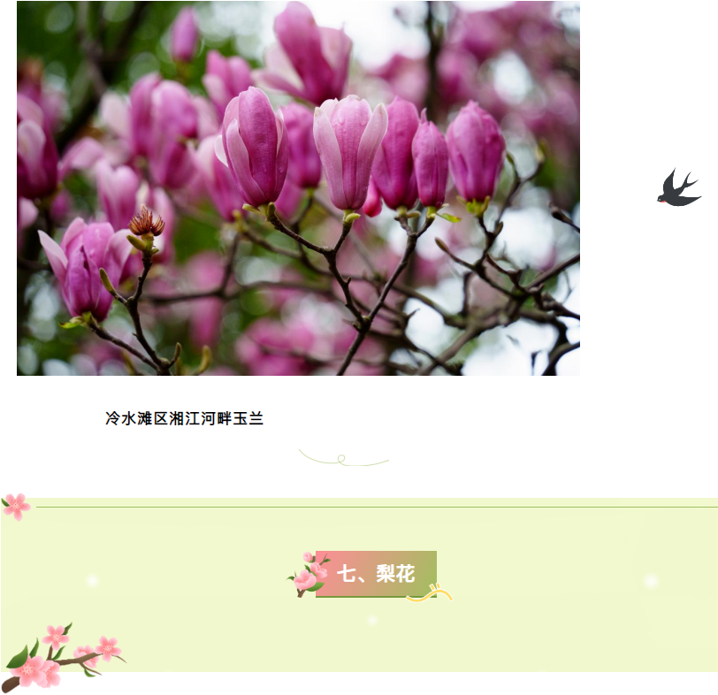 推薦地點: 冷水灘區湘江河畔:紫玉蘭沿江綻放,綠道漫步感受“玉蘭迎春,江水回暖”的清新意境。