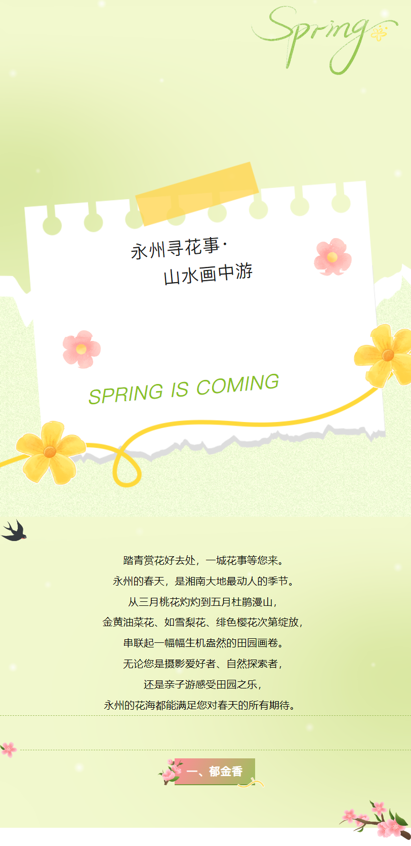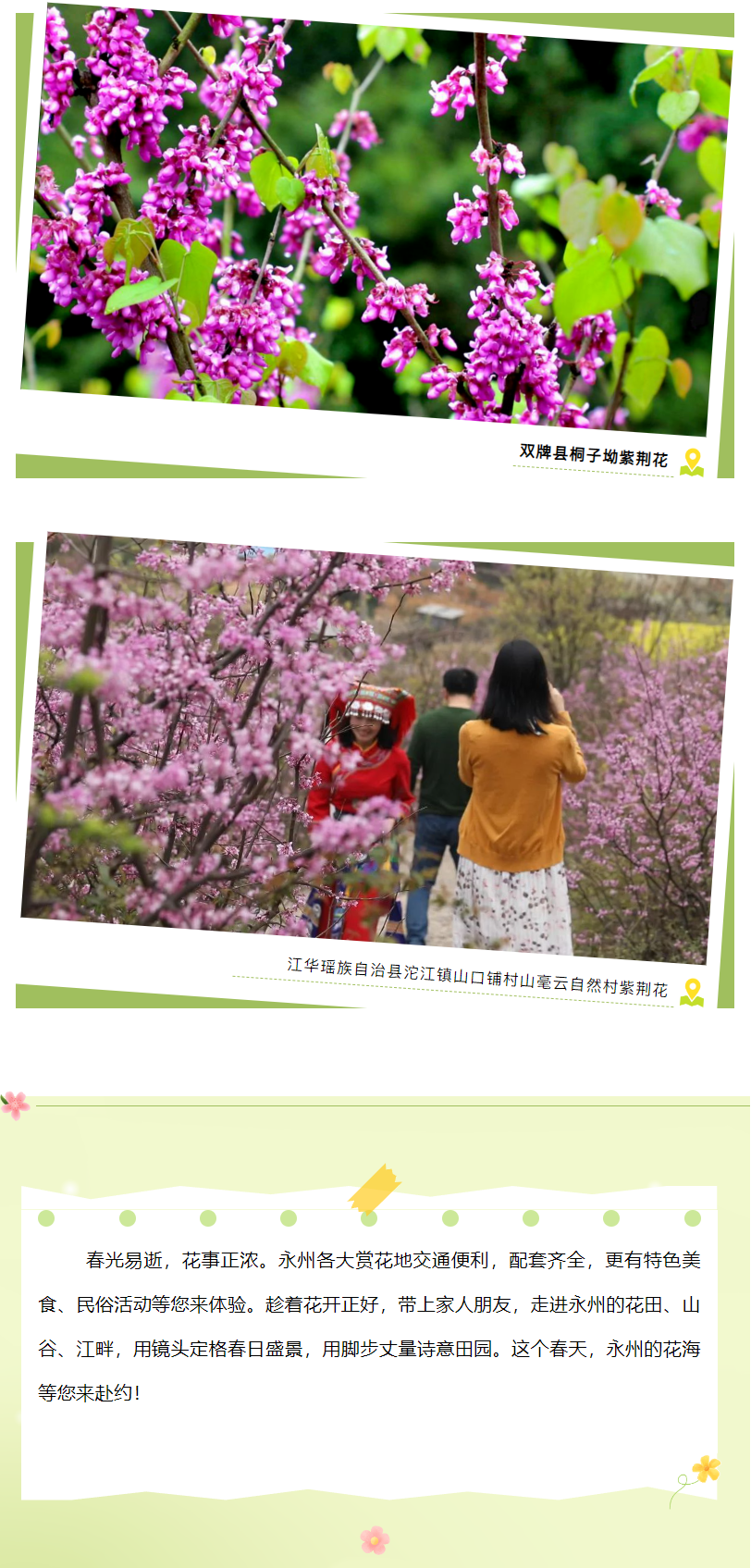 1.冷水灘區蔡市鎮零東圩產業園、花橋街鎮敏村景區、楊村甸鄉騰云嶺生態文化園、黃陽司鎮:冷水灘區分布著成片桃林,以桃紅碧桃、白桃為主桃林綿延如粉色云霞,形成人間芳菲的春日畫卷,航拍野餐兩相宜。