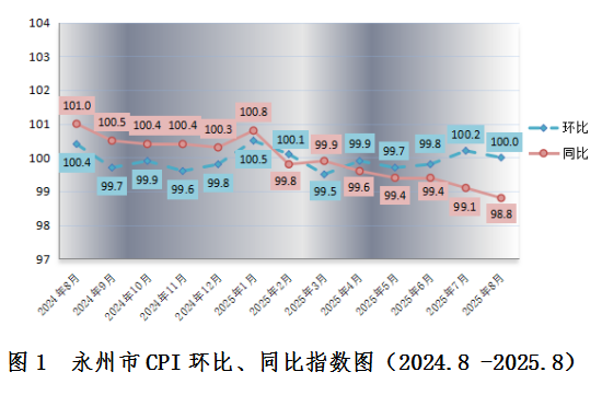 2025年8月份,食品供應總體充足,永州居民消費價格(CPI)同比價格下跌1.2%,環比價格持平。