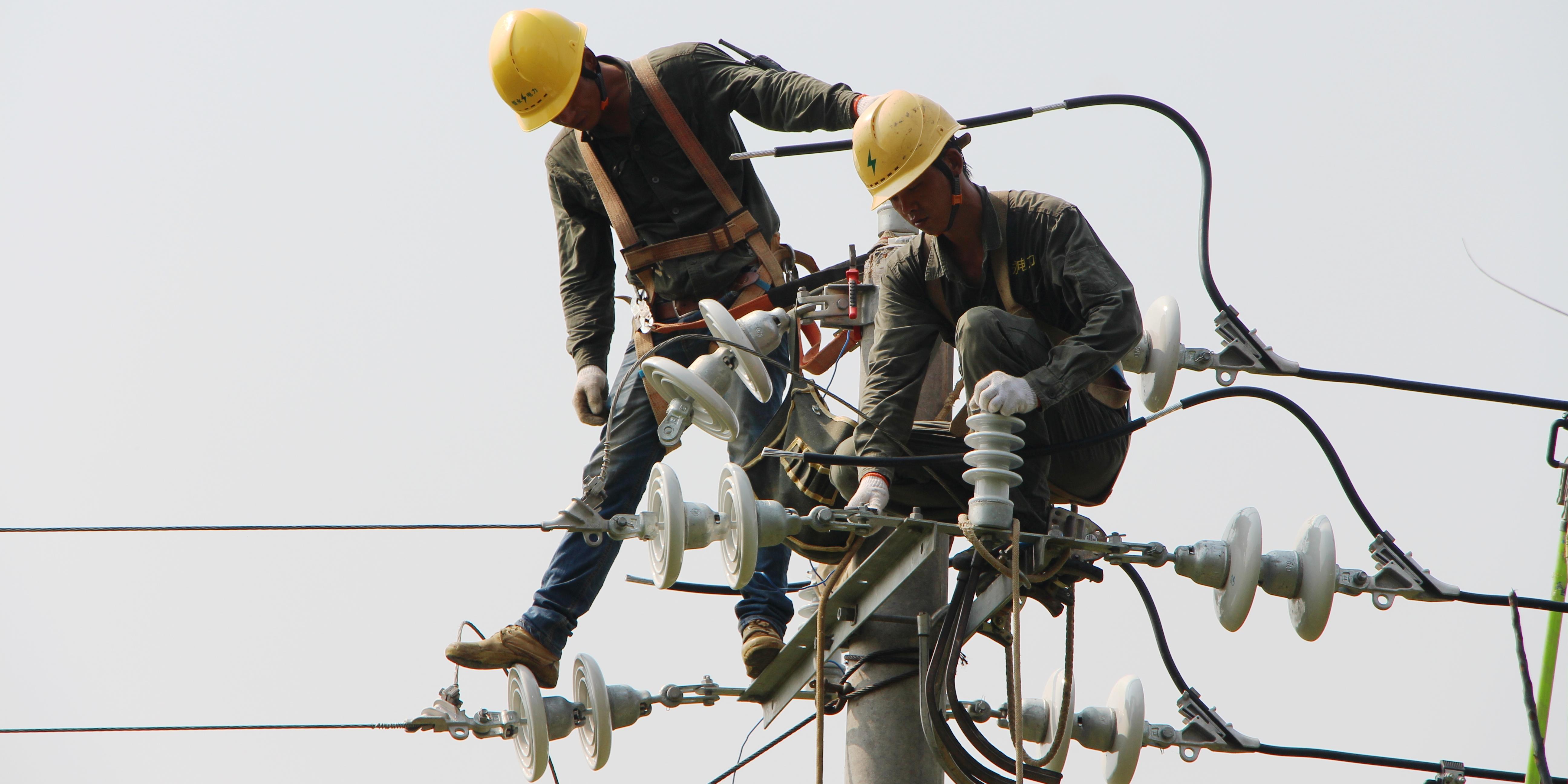 (8月28日,國網永州供電公司員工在江永縣瀟浦鎮和興村展放10千伏線路導線。 龍云 攝)