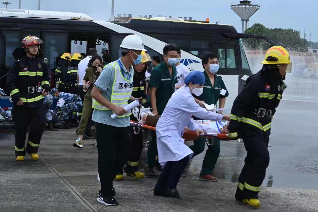 本次演練以某航班突發異常迫降永州機場時沖出跑道,導致機體冒煙、明火,旅客受困等險情為背景,模擬演練了機場指揮中心接收信息、啟動應急響應、發布緊急指令,調動消防、應急、醫療等救援單位馳援現場處理險情等民航事故應急救援的全部流程。參演各單位緊密配合、協同作戰,圓滿完成空中特情處置、現場指揮部搭建、航空器迫降、地面救援、殘損航空器搬移等5個科目12個環節的演練任務。
