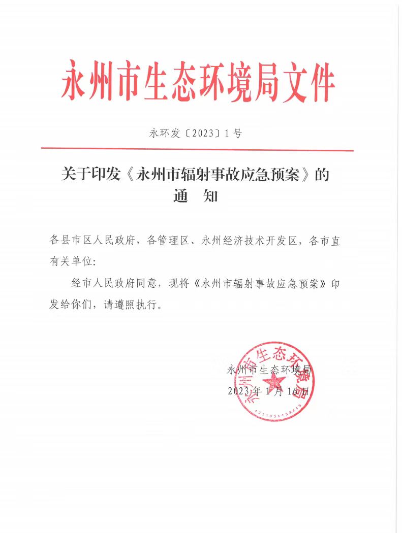 關于印發《永州市輻射事故應急預案》的通知