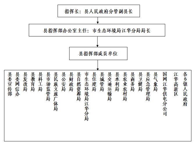 指揮部指揮長由縣人民政府分管生態環境工作的副縣長擔任;副指揮長由縣人民政府辦公室協助管理生態環境工作的副主任和市生態環境局江華分局局長、縣氣象局局長擔任。