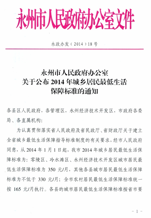 永州市人民政府辦公室關于公布2014年城鄉居民最低生活保障標準的通知