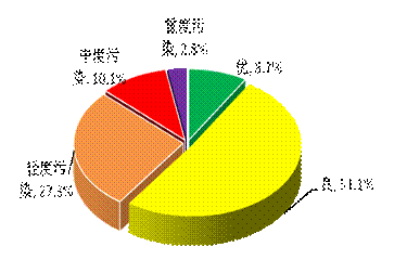 按照《環境空氣質量標準》(GB3095-2012),2016年1月份,我省14個城市環境空氣質量達標天數比例范圍在29.0%~86.7%之間,平均達標天數比例為59.8%;平均超標天數比例為40.2%,其中輕度污染占27.3%,中度污染占10.1%,重度污染占2.8%,無嚴重污染天氣。影響城市環境空氣質量的主要污染物是細顆粒物(PM2.5)。