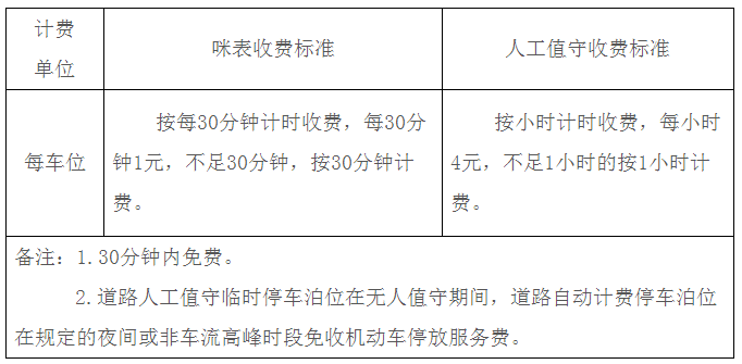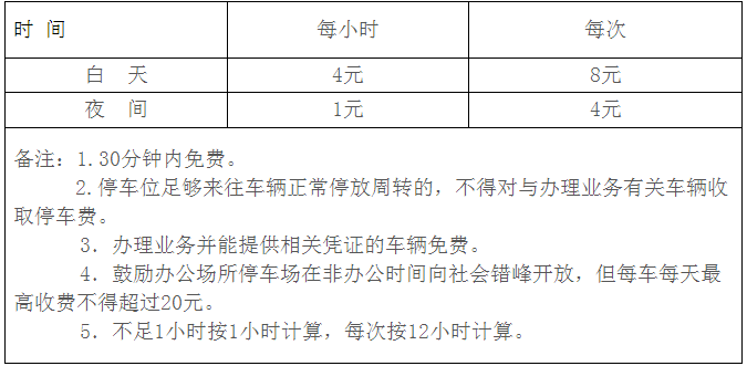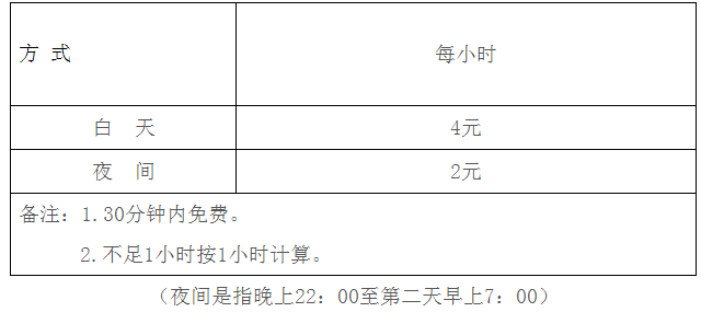 (公布的收費(fèi)標(biāo)準(zhǔn)以小汽車為準(zhǔn),其他車型比照所占小汽車位計(jì)費(fèi),摩托車(電動(dòng)車)按不超過(guò)小車標(biāo)準(zhǔn)四分之一收取。)