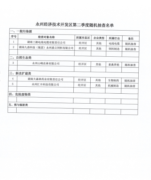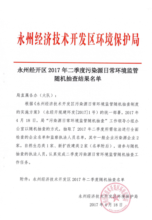 永州經開區2017年二季度污染源日常環境監管隨機抽查結果名單
