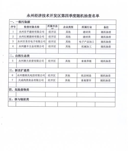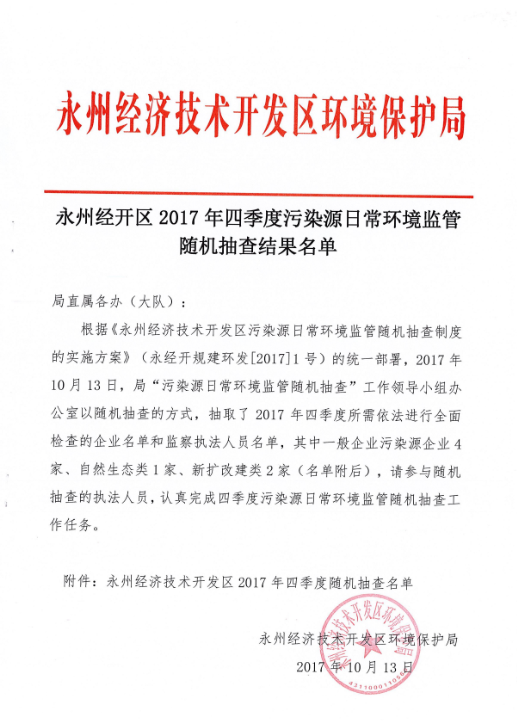永州經開區2017年四季度污染源日常環境監管隨機抽查結果名單