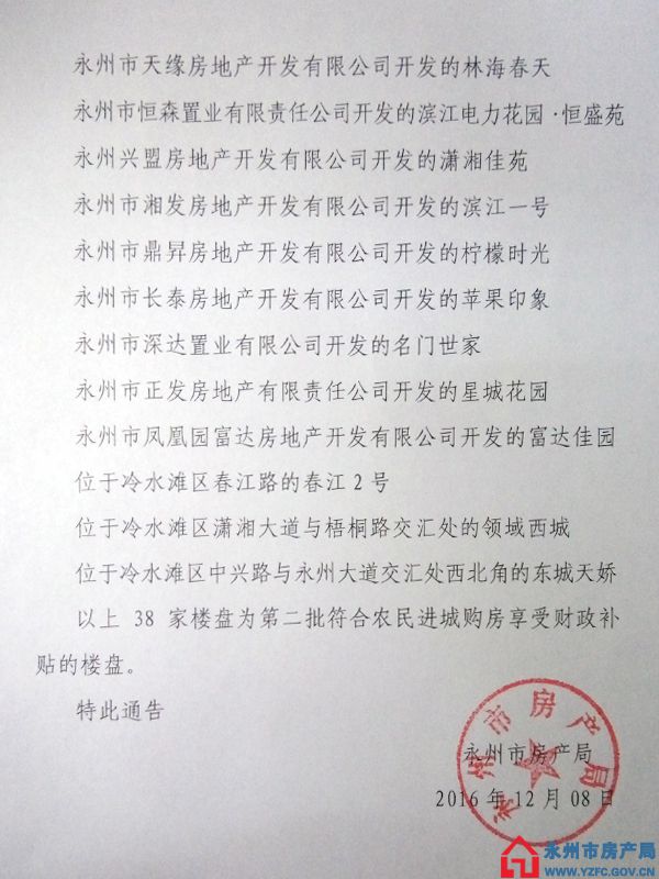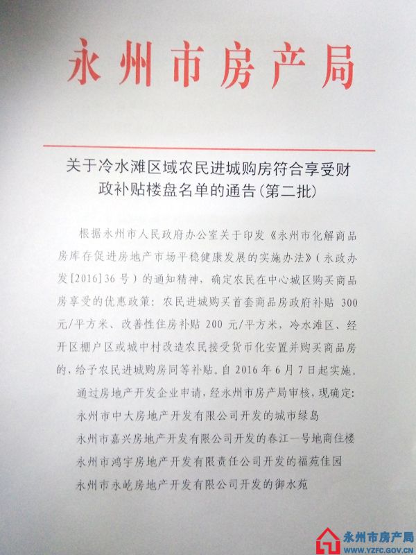 關于冷水灘城區農民進城購房符合享受財政補貼樓盤名單的通告(第二批)