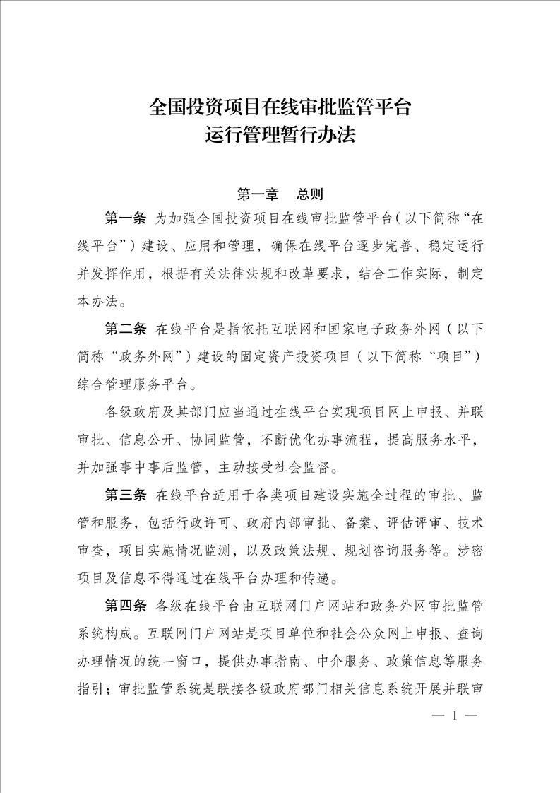 全國投資項目在線審批監管平臺運行管理暫行辦法