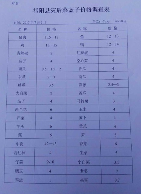 7月1—2日,祁陽(yáng)縣遭受洪災(zāi)侵襲,這次洪水已超過歷史最高水位88.51米,達(dá)到89.08米。這次洪災(zāi)對(duì)全縣蔬菜造成了很大的損失,全縣蔬菜(各類)受災(zāi)面積11.2萬(wàn)畝,成災(zāi)面積9.7萬(wàn)畝,絕收面積3.2萬(wàn)畝,由于德輝、天之龍、百蔬園、大自然等大型蔬菜基地,都在湘江河或小河邊,這次損失慘重。7月2日,縣農(nóng)業(yè)信息站到農(nóng)貿(mào)市場(chǎng)進(jìn)行調(diào)查(見附表),通過這次調(diào)查發(fā)現(xiàn)雞、鴨、魚、肉等肉類產(chǎn)品價(jià)格與災(zāi)前基本持平,瓜果類價(jià)格上漲10%左右,葉菜價(jià)格每500克增加1—2元。由于湘江水位退水速度緩慢,基地原有的蔬菜部分被水沖走,大部分會(huì)爛在地上。因此,要快速開展生產(chǎn)自救,種植速生菜,補(bǔ)給市場(chǎng)、抑制菜價(jià),同時(shí)要從受災(zāi)較輕的地區(qū),調(diào)劑蔬菜,彌補(bǔ)蔬菜短缺,確保蔬菜市場(chǎng)價(jià)格穩(wěn)定,并要加強(qiáng)市場(chǎng)監(jiān)管,狠狠打擊欺行霸市的行為,維護(hù)社會(huì)穩(wěn)定。