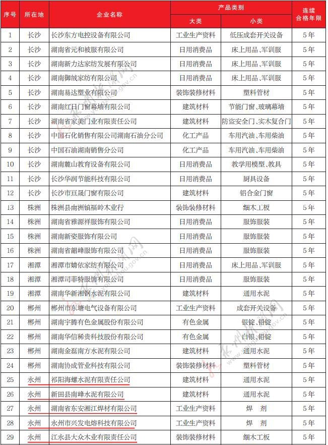 產(chǎn)品質(zhì)量監(jiān)督抽查連續(xù)5年合格企業(yè)名單