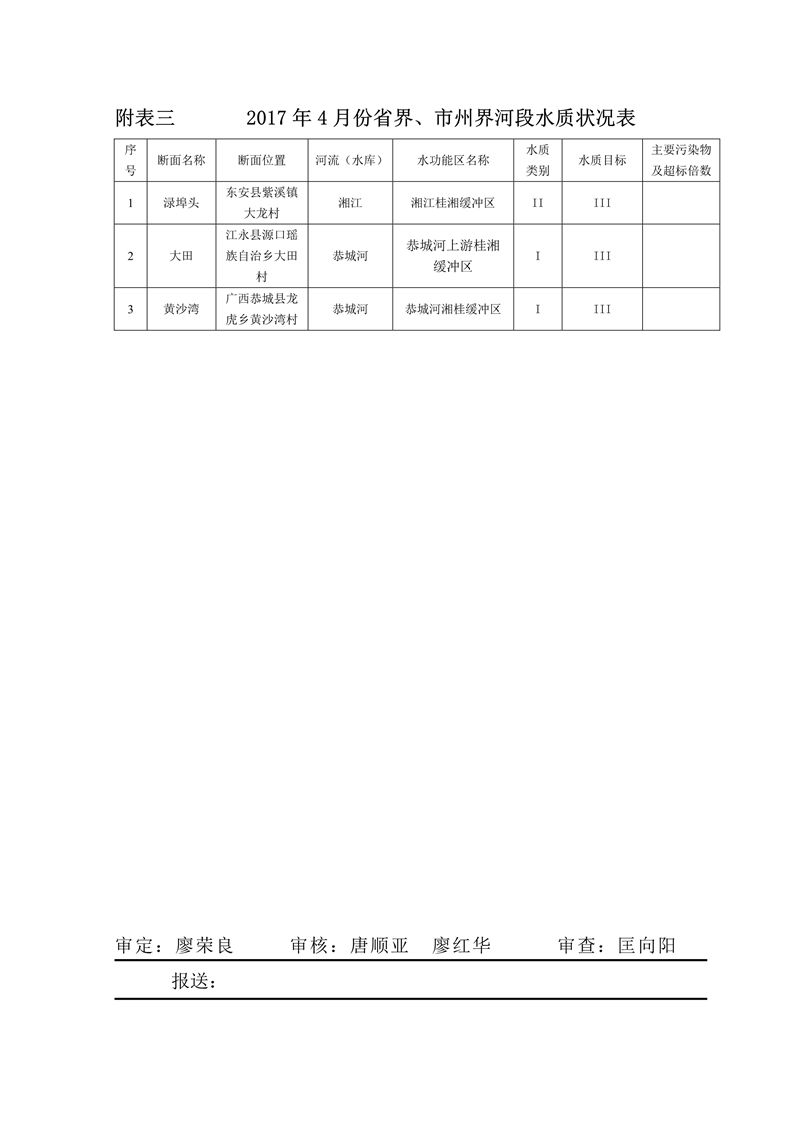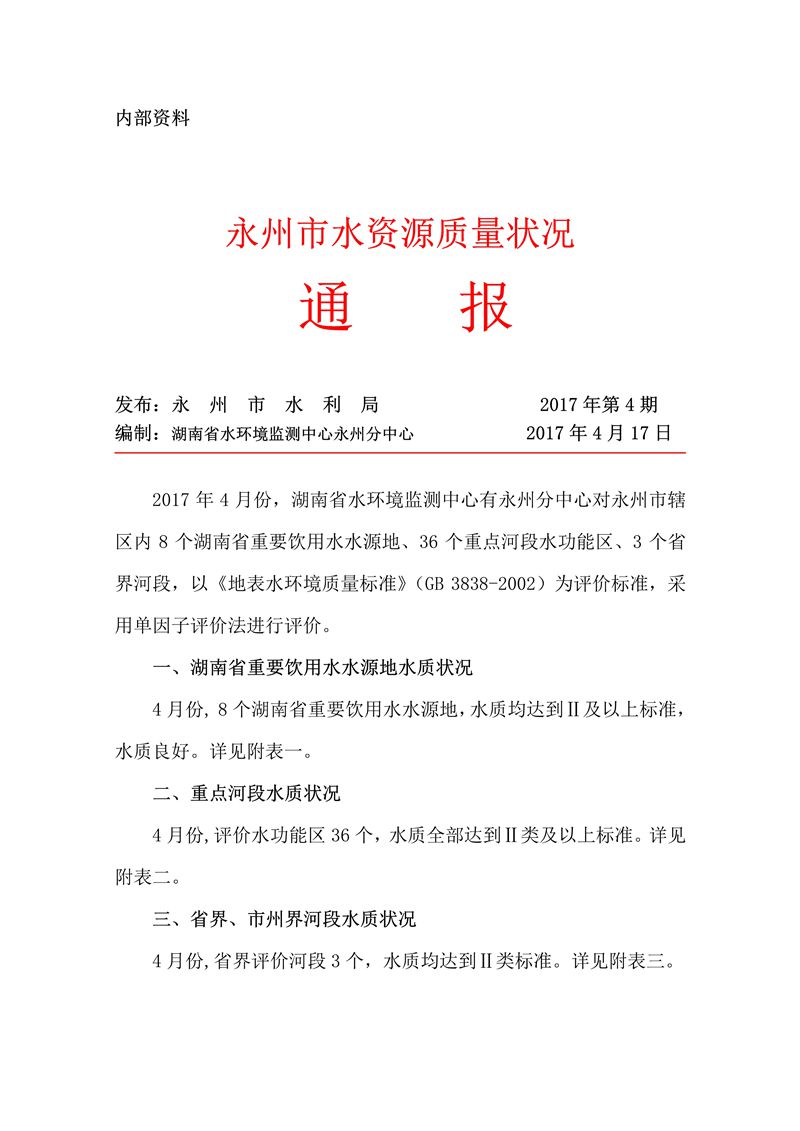 2017年4月永州市水資源質量狀況通報