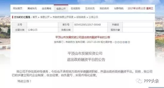 目前,地方急匆匆發(fā)公告退出融資平臺,一個(gè)原因是財(cái)政部正對違規(guī)融資行為清理整改,退出融資平臺后城投可以不受地方債務(wù)監(jiān)管政策的約束。另一方面,城投公司則可轉(zhuǎn)變?yōu)樯鐣?huì)資本,可繼續(xù)參與PPP和政府購買服務(wù)項(xiàng)目。
